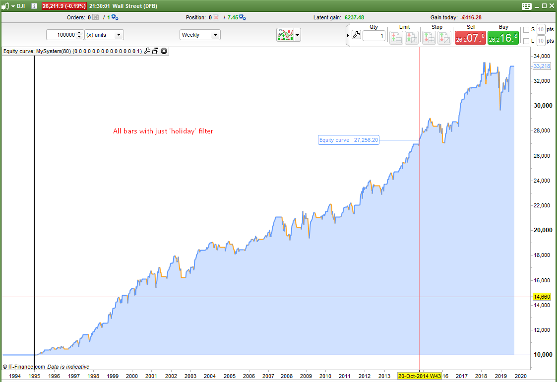 So I took this info and put it back into my original strategy. The four equity curve images show the results. All four are very nice equity curves with very low draw down. The equity curve of the chart showing buying on all bars has not performed very well recently but the the ones buying on dips have. Also the buying on dips except in holidays have far higher average gain per trade at almost 149 compared to just under 89 for buying every bar except in holidays.