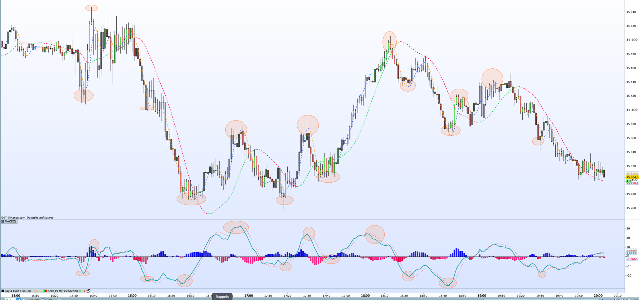 Now, for Swing H/L, you can see on the attached graph (Dow 1min TF) that when the price reverses in a significant manner the MACD (the “e”) changes direction. You may want to test it on TF 2min (or any other TF) for Exit. Is this what you’re looking for?