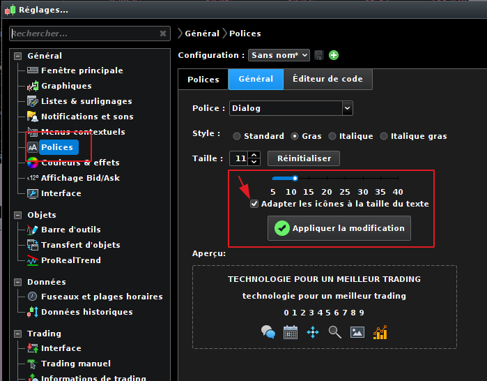 Ajustez la taille de la police via la réglette et cochez la case “Adapter les icônes à la taille du texte”