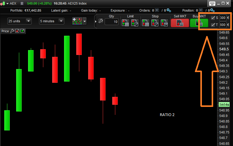 Example. I have created 2 screenshot with an example. Let’s suppose that we want to obtain a RISK/REWARD RATIO = 2. In this case we are happy with a Profit of 600 Euros and we don’t want to loose more than 300 Euros (600/300=2):