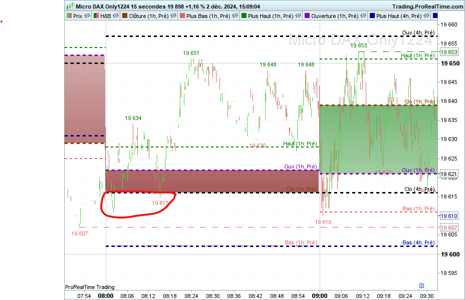 Bonjour je voudrais crée un indicateur comme un sorte de stochastique. J’ai reporté chaque session d’une heure : haut bas clôture ouverture sur la session d’après. Je voudrais affiché en dessous des prix le temps que le prix à passé au dessus de l’ouverture mais aussi de la clôture. Je vous joins un graphique pour vous montrer en entourant ce que je voudrais que l’indicateur m’affiche….Car cela me permet de montrer une ouverture et clôture forte où il y a une pression acheteuse ou vendeuse.