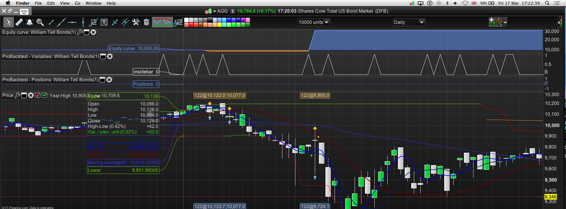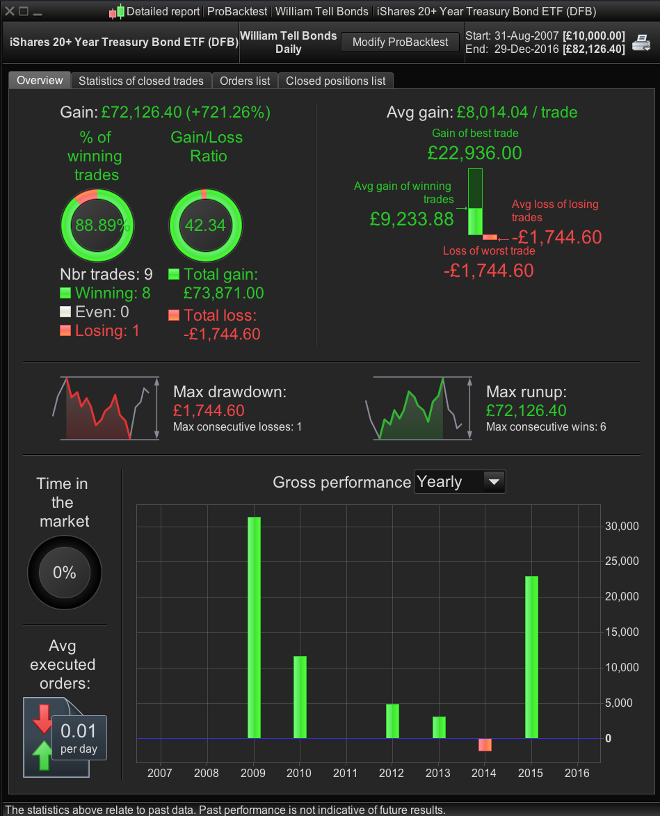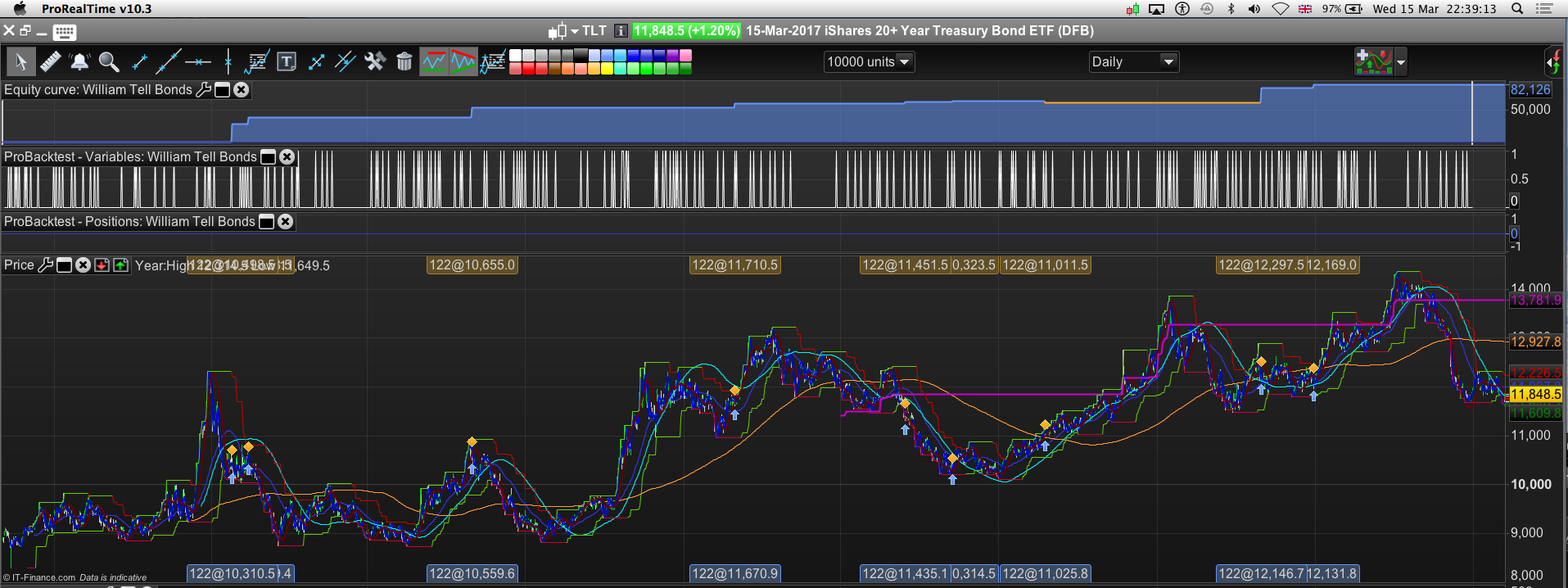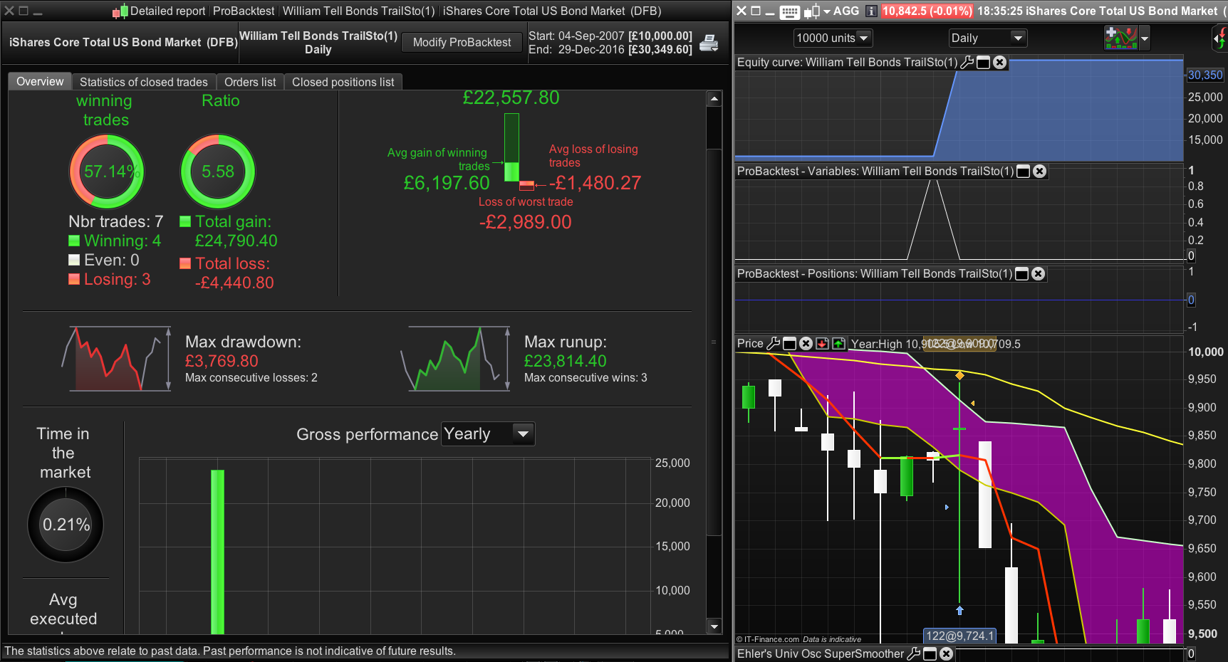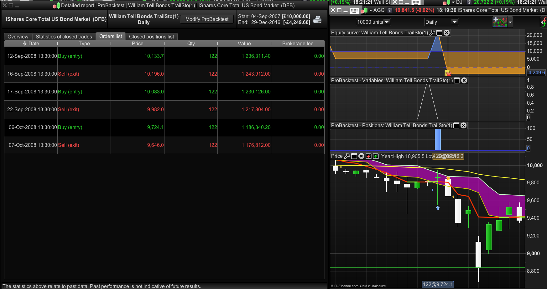 William Tell Bonds had previously produced the results in post #28465 above (6 winners out of 8 and £29k profit). It produced that profit this afternoon. I tried the system on the iShare 20+yr Treasury Bond EFT and went back to the Core Bond market and now it only takes 1 (losing) trade instead of 8 and makes a-£14,286 loss?