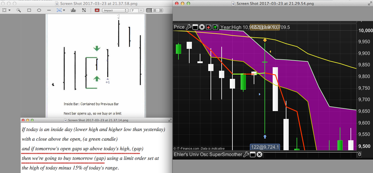 About your example, the green candle was bullish, it was an inside day so we took decision to trade in the white hammer candle the day after (at close), the order limit put at the open of the long doji candle has been succesfully fulfilled at “buylevel” calculated by the green candle that generate the signal. Everything is in concordance with the strategy, for me 🙂