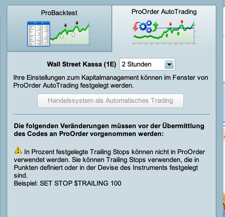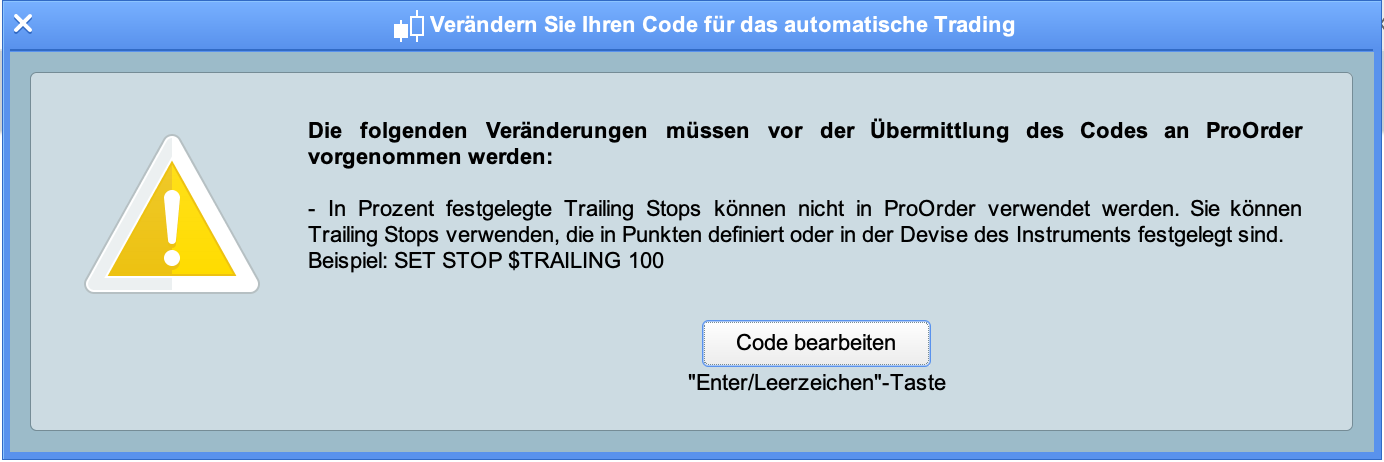 Okay i delete row 53. In the testrun it comes to the same Result. But Proorder forbids me to go live (see screenshot). It Says that, i cant go live with an %Stop oder %Trailingstop. It must be a $ Stop, Points or else… why does IG make such restrictions? 🙁