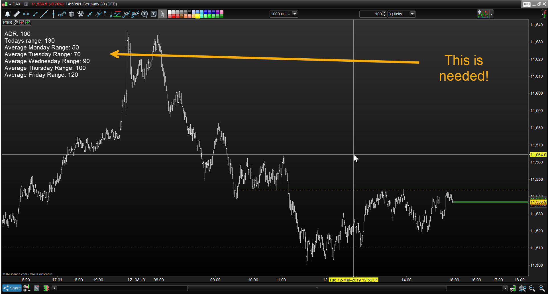 Getting the text aligned to the left at the start of the day. I modified the PRC_TSR_DailyRange_display indicator to get what you see on the chart but its messy.