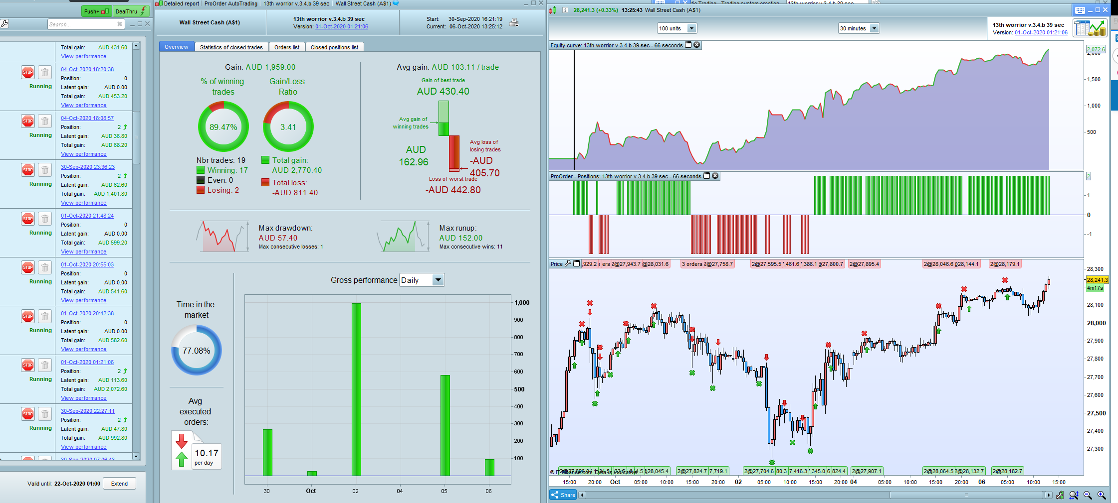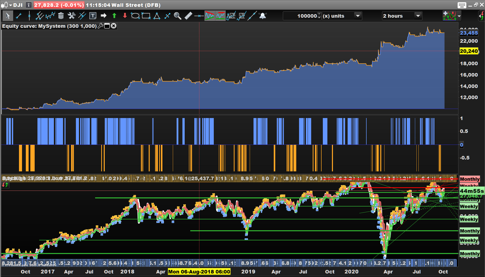 I tried it for day trading in various x-seconds (2, 6 19, 24, 71) , but they need readjustment every 2 or 3 days. the ones i started 4 days ago still work, but they fail in the simulation at the current date. because of that I added a maximum for the strategy profit and trading time limitation in some versions, to lower the risk of loosing the gains. some gained 1000$ over night, but the bad trades are mostly really bad. the Friday crash was really bad and took all the gains from the days before. Also good results with HUF Hungary 12 cach (13thworrior v1.3 HUF 30min.itf)
