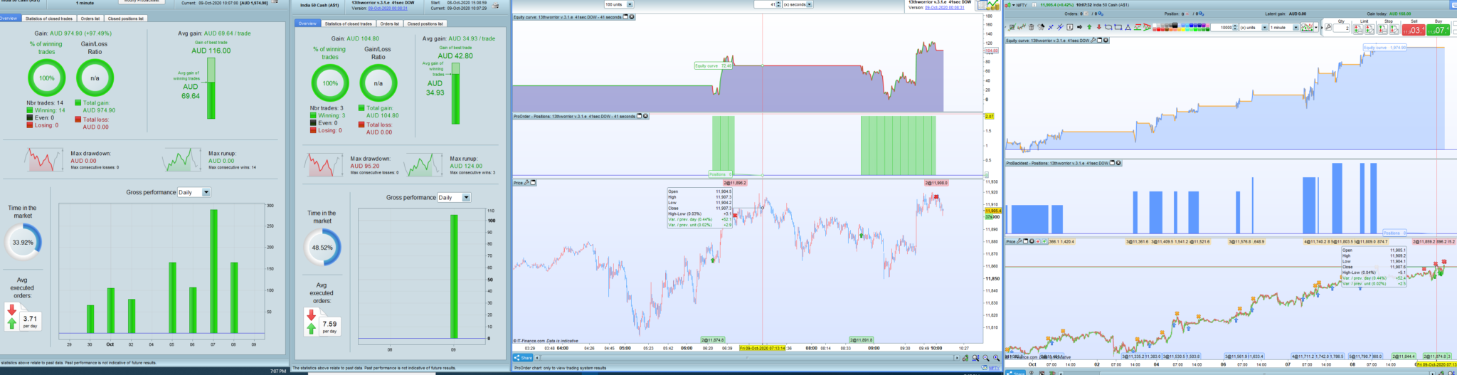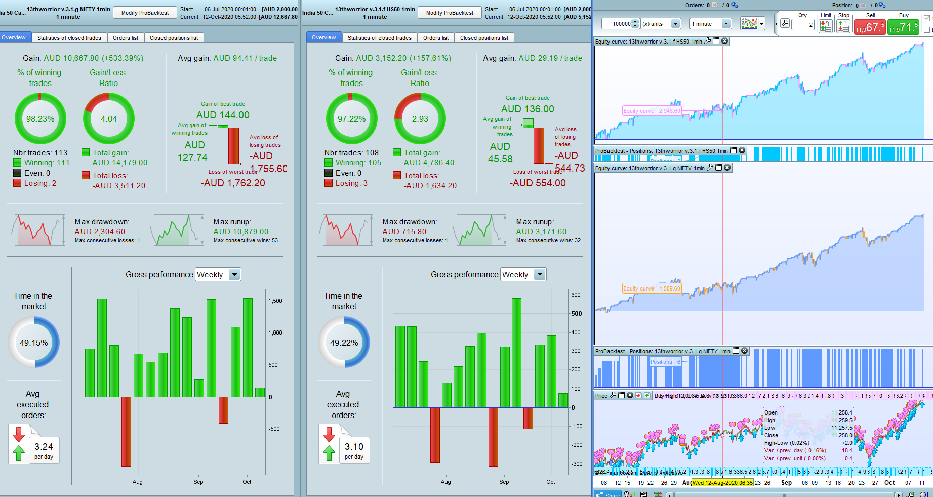 NIFTY India 50 cash $1, 1minute, with and without money management . minimum contract size 2