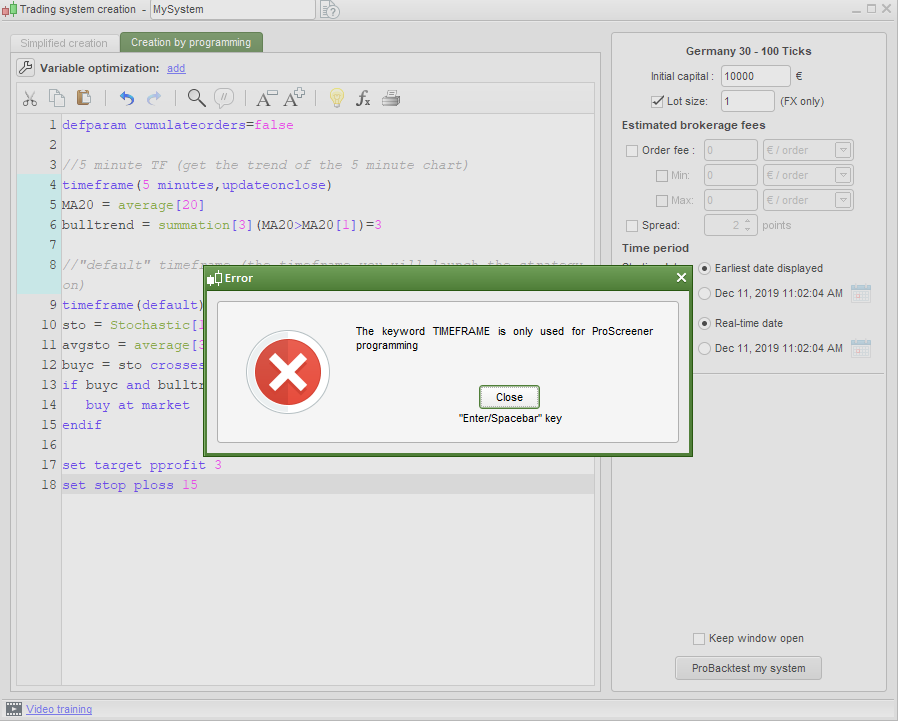 Nel momento in cui clicco su “ProBacktest my system” mi viene dato un popup di errore con la dicitura: