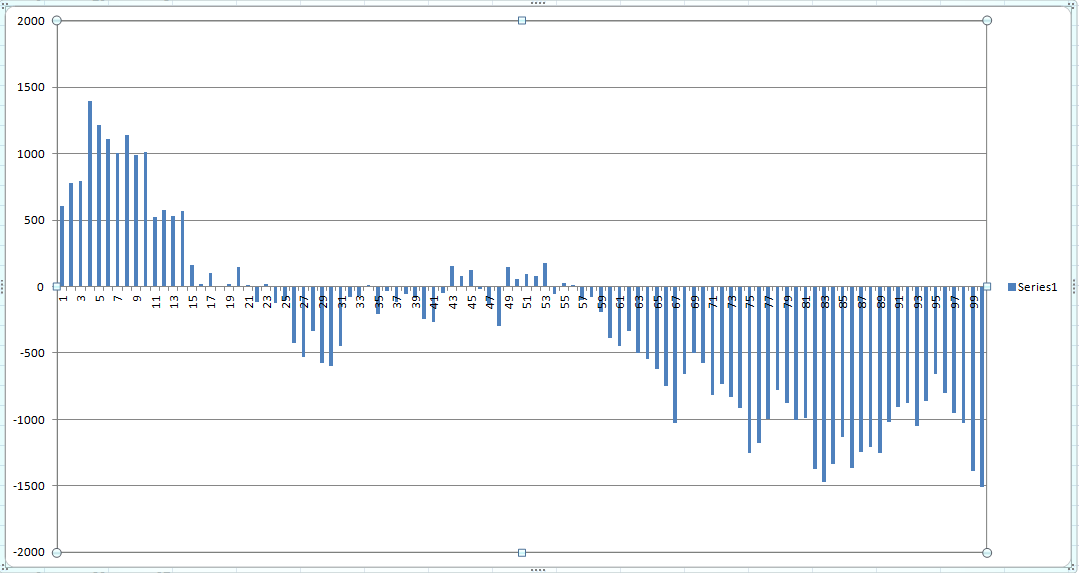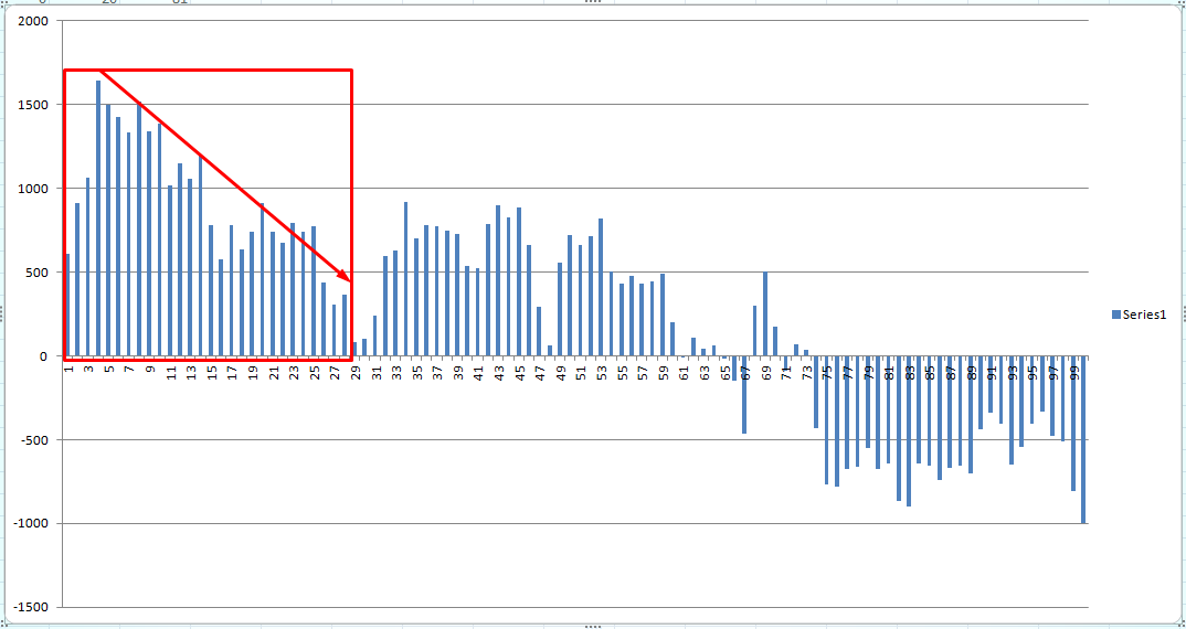 All is not totally lost for the strategy though as it does help us analyse how long it is wise to hold on to a position after one of these entries. If you remove all other exit conditions and then run a optimisation back test and then put the results in an Excel graph then we can see that there is definitely a range where holding is profitable but hold too long and watch any potential profits disappear.