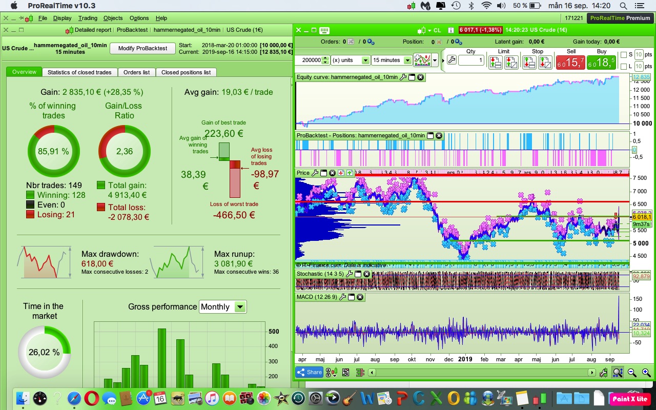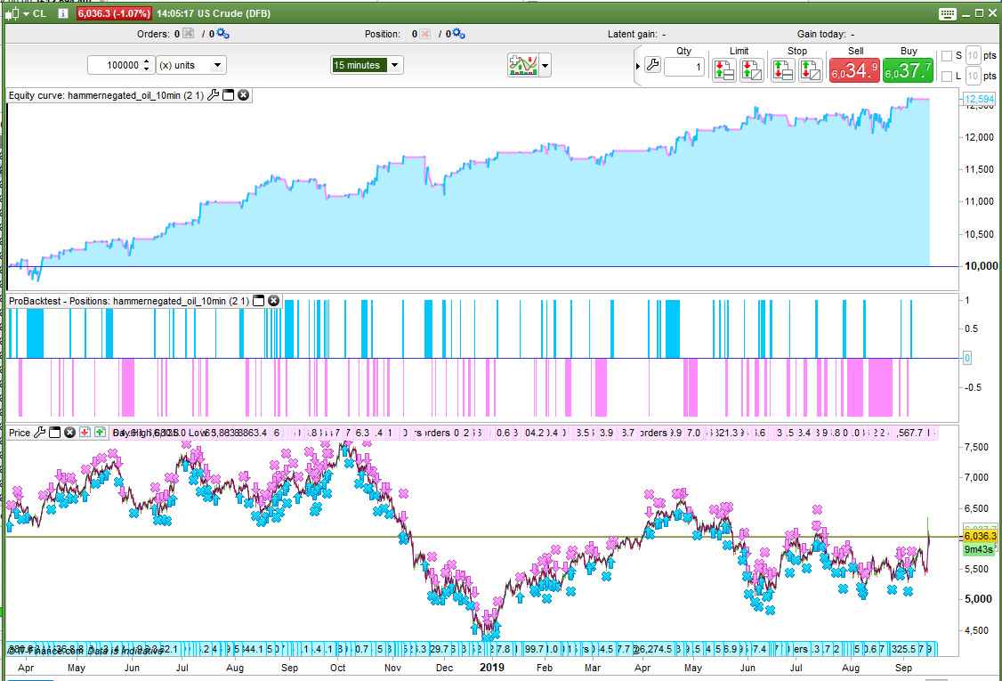 I also found Francesco’s oil hammer negated strategy works consistently well on 15min TF. Here’s the link to it: https://www.prorealcode.com/prorealtime-trading-strategies/oil-10min-hammernegated-pattern-strategy/
