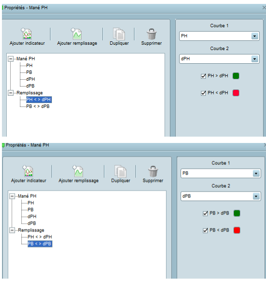 Pour l’indicateur les 2 courbes du bas représentent le dernier point bas (PB) et le point bas d’avant (dPB) et pour les courbes du haut c’est la même chose pour les derniers points haut (PH et dPH)