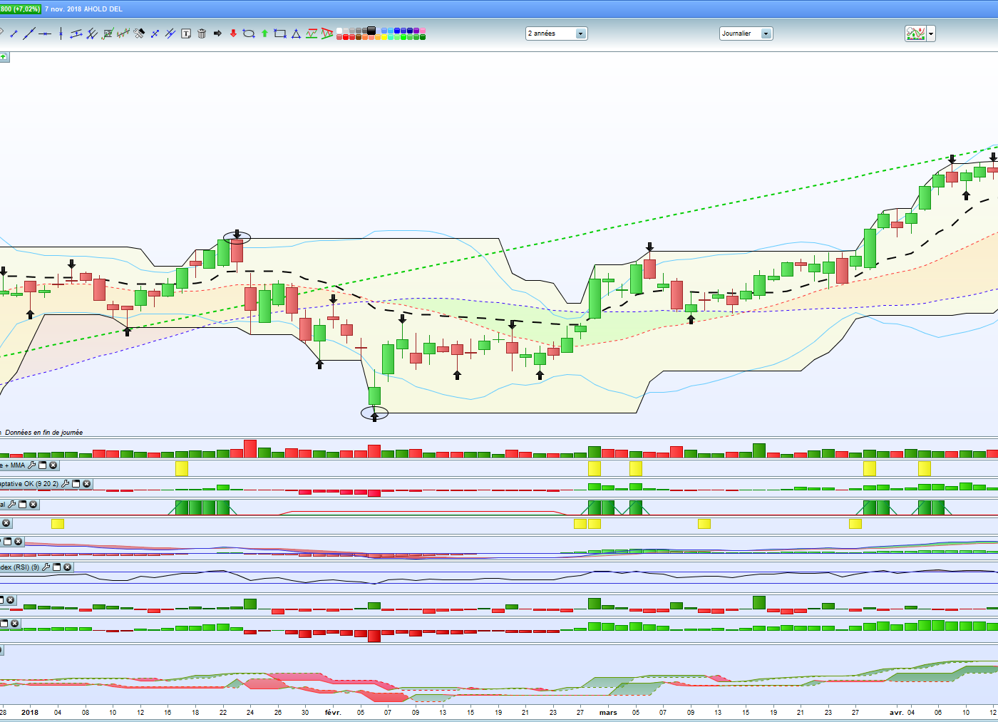 Merci Lucky. Effectivement quand les bandes convergent vers une même valeur c’est souvent un point de basculement. Un exemple en pièce jointe sur CARREFOUR