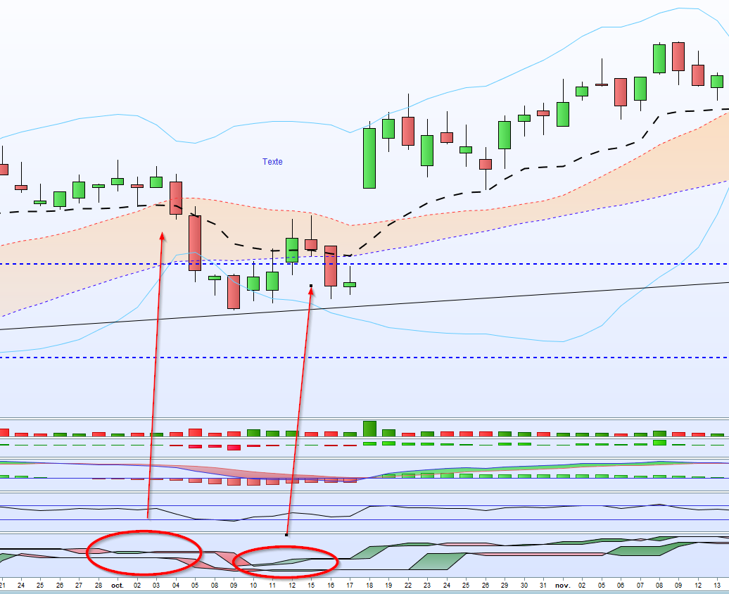 par exemple si les bandes supérieures se resserrent et passent du rouge au vert et que les bandes inférieures sont presque vertes c’est plutôt bon signe.