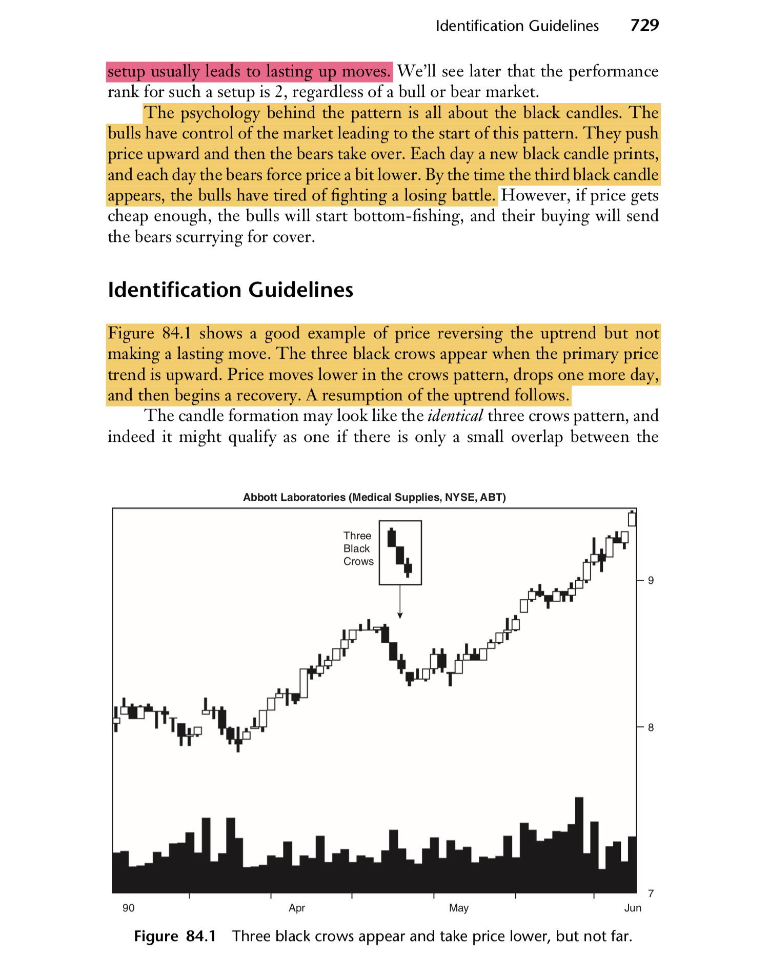 Often when you believe a pattern should be indicated on the chart it is not. This can be due to some tight restrictions on the description/conditions of the pattern, perhaps concerning the range / ratios of a candlesticks body relative to other candles, but here in the case of the “Three Black Crows” I seem to be finding many examples on daily charts that are not being indicated?
