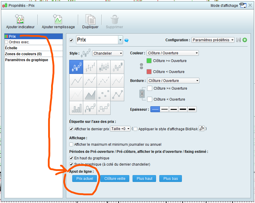 (1/2) … Assuming your platform is in French, click on “prix” in top left corner of price window, then click on “configurer”, a window opens, if in the left part “prix” is selected, then, in the right part you might have to scroll down or widen the window to see appearing at the bottom “Ajout de ligne” with 4 buttons to choose from, the first one being “prix actuel” (see attached image). It will move with current price.