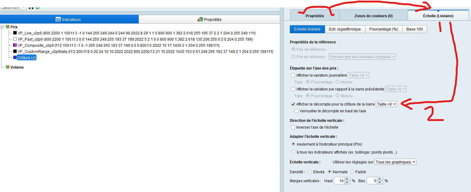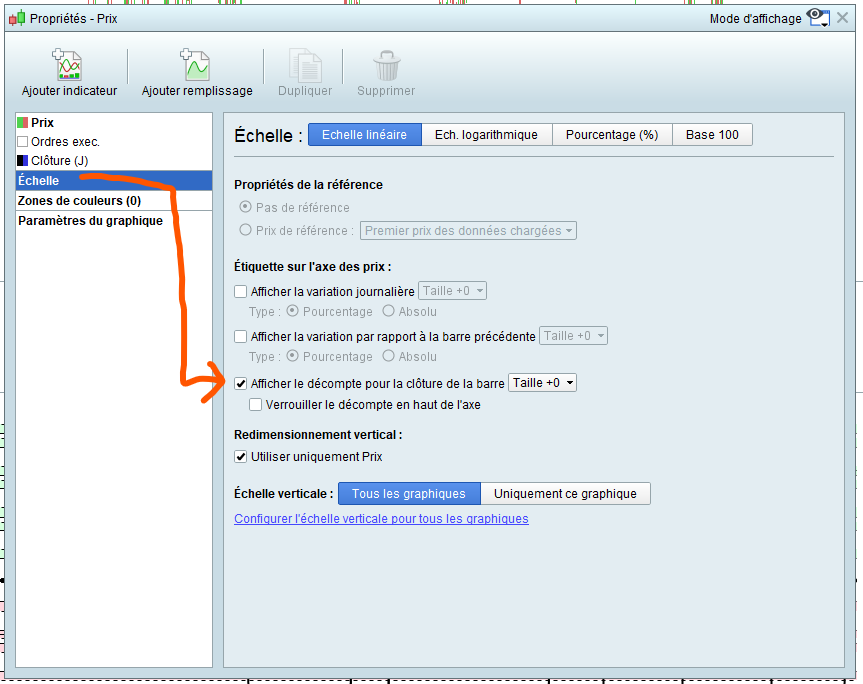 From same price properties window as above (click on « price » then « configurer »), you need to select « échelle » this time, and on the right side, select box « afficher le décompte pour la clôture de la barre » (see attached image).