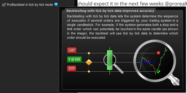 Because a lot of people are awaiting this, and because I answer soooo many questions about the new tick/tick backtest of ProBacktest, I let you know that it’s working ‘almost’ perfectly to my own tests so far.