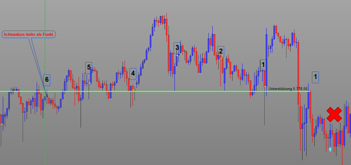 Hier liegt der 6. Schlusskurs unter dem Schlusskurs von gestern. Der Trade hätte nicht gemacht werden dürfen??!!