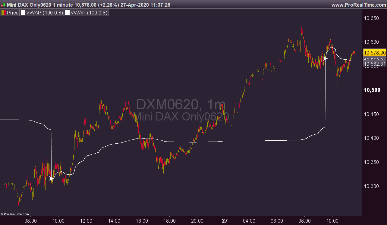 RETURN VWAP coloured by color STYLE(LINE,1) as "VWAP"