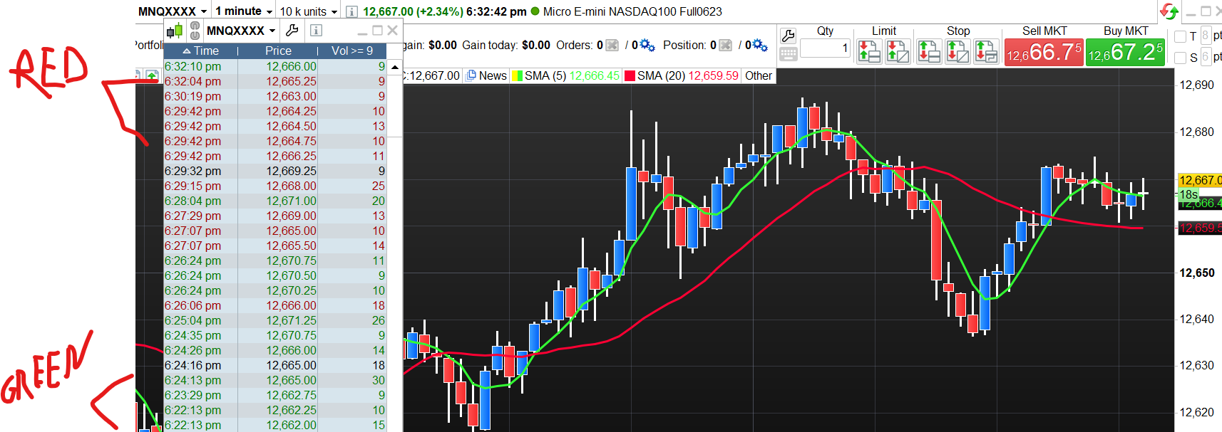 So for example I open the nasdaq future graph 1 minute time frame then I open his time & sales set to display only volume equal or bigger then 5(or any other numer that I can put), so for any candle of my timeframe, I would like to have an indicator under the price that show the difference beetween green order and red order (equal or bigger then 5 as before) taken from time and sales.