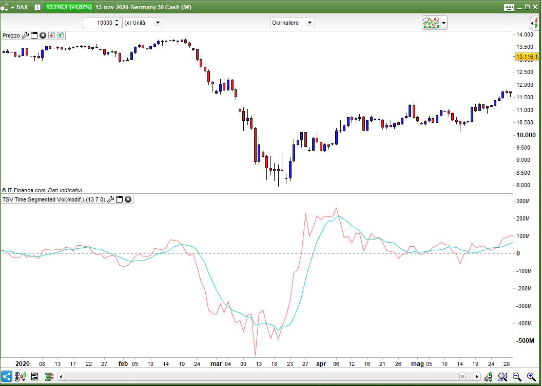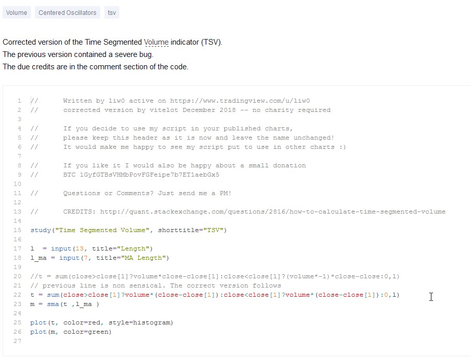 I think the formula I used (TSV=(Sum( IIf( C > Ref(C,-1), V * ( C-Ref(C,-1) ), IIf( C < Ref(C,-1),–V * ( C-Ref(C,-1) ), 0 ) ) ,18));) has an unneeded “-” sign in front of the second reference of V (volume). Since it negates an already negative value, thus making it positive and affecting the subsequent sum.