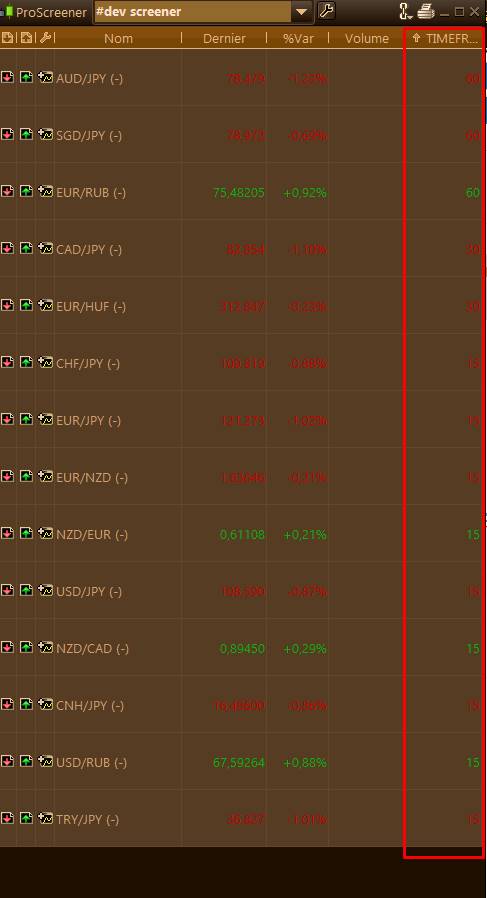 L’idée du screener est de regarder dans 3 UT différentes mais lorsque l’instrument s’affiche j’aimerais avoir une colonne “Timeframe” avec comme valeur 15, 30 ou 60. Ces valeurs représenteraient le Timeframe dans lequel s’est déclenché l’alerte.
