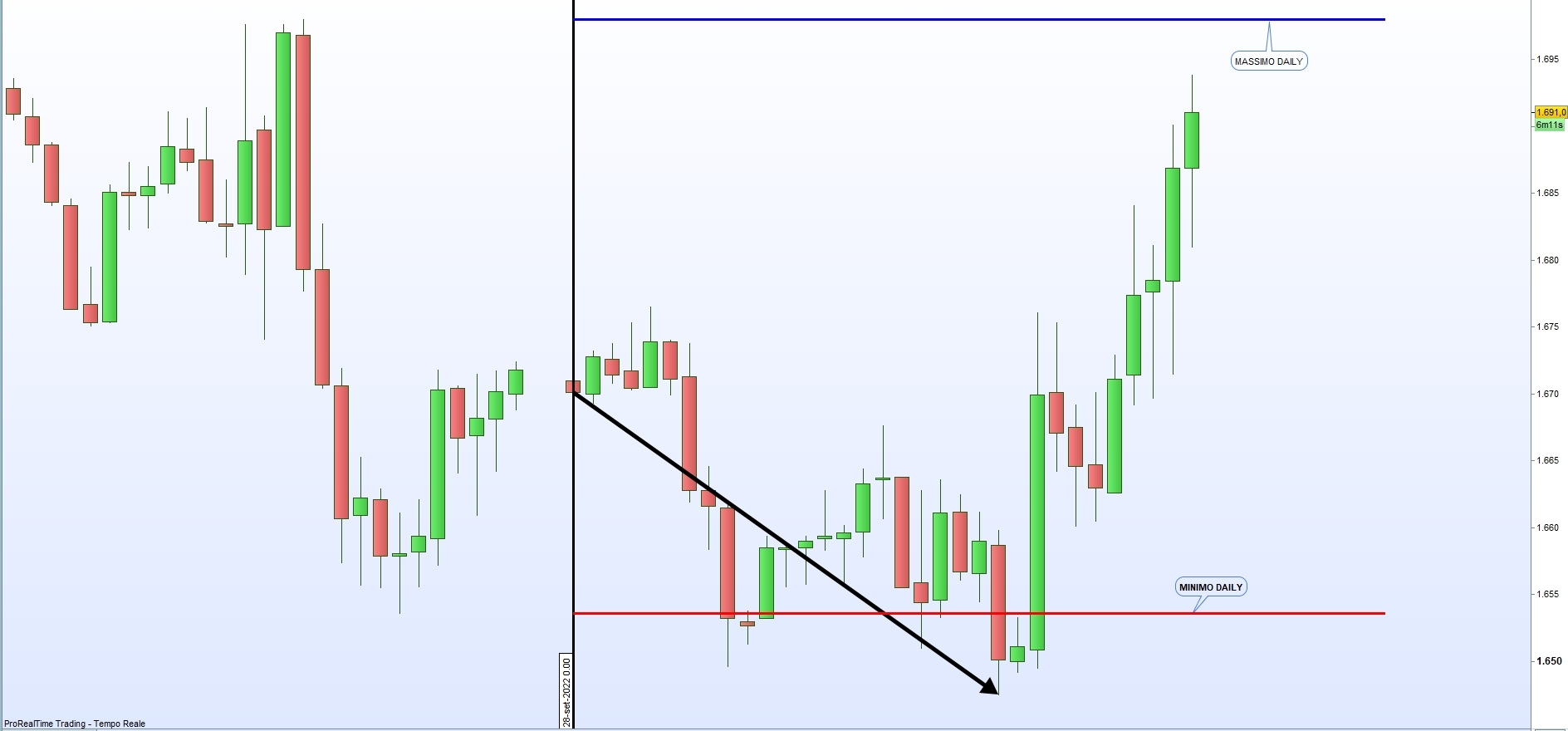 esempio in un TF 30 quando il prezzo supera il massimo o il minimo del giorno precedente traccia una linea che parte dall’open odierno al massimo o minimo in quel dato momento, se poi il prezzo rintraccia la linea termina come da file allegato.