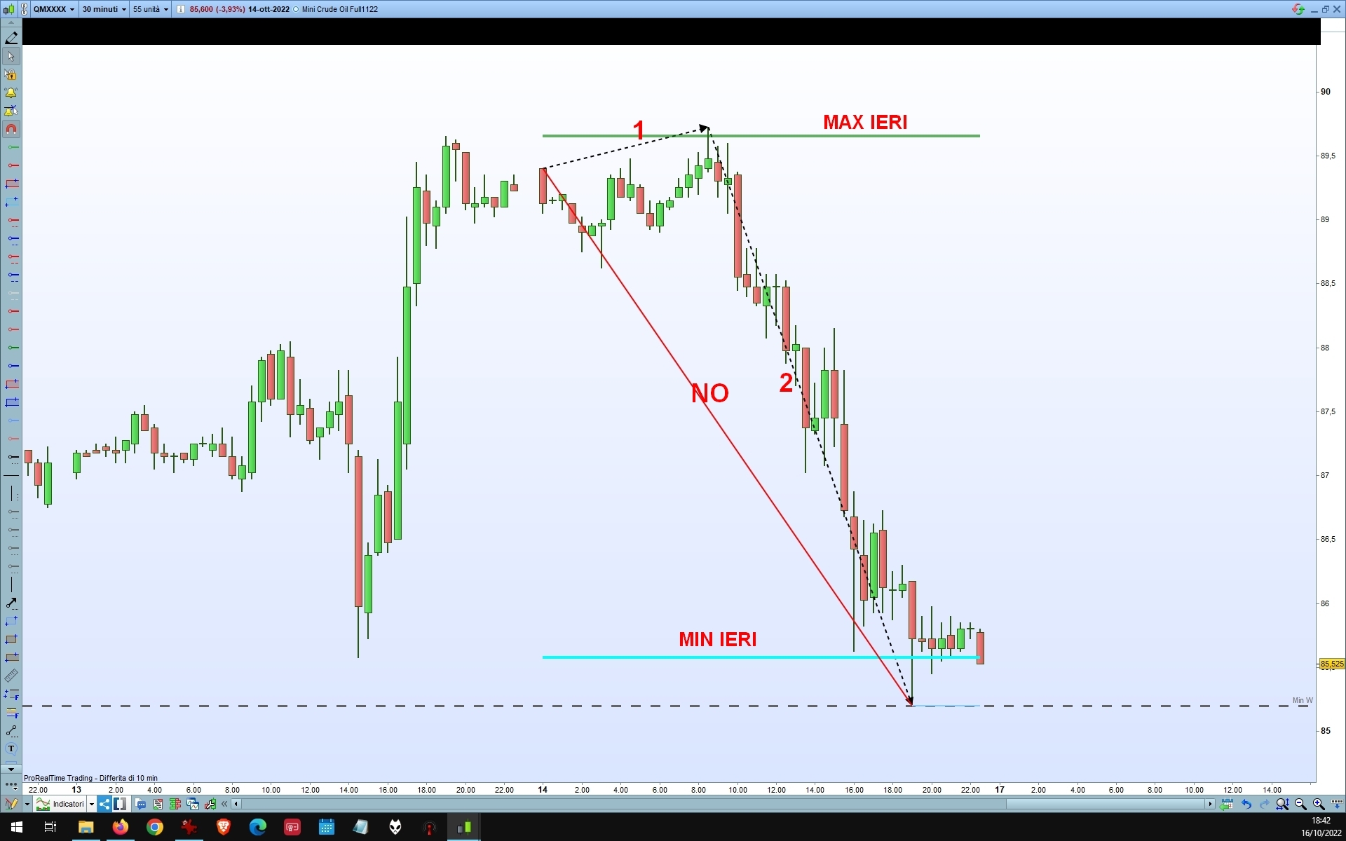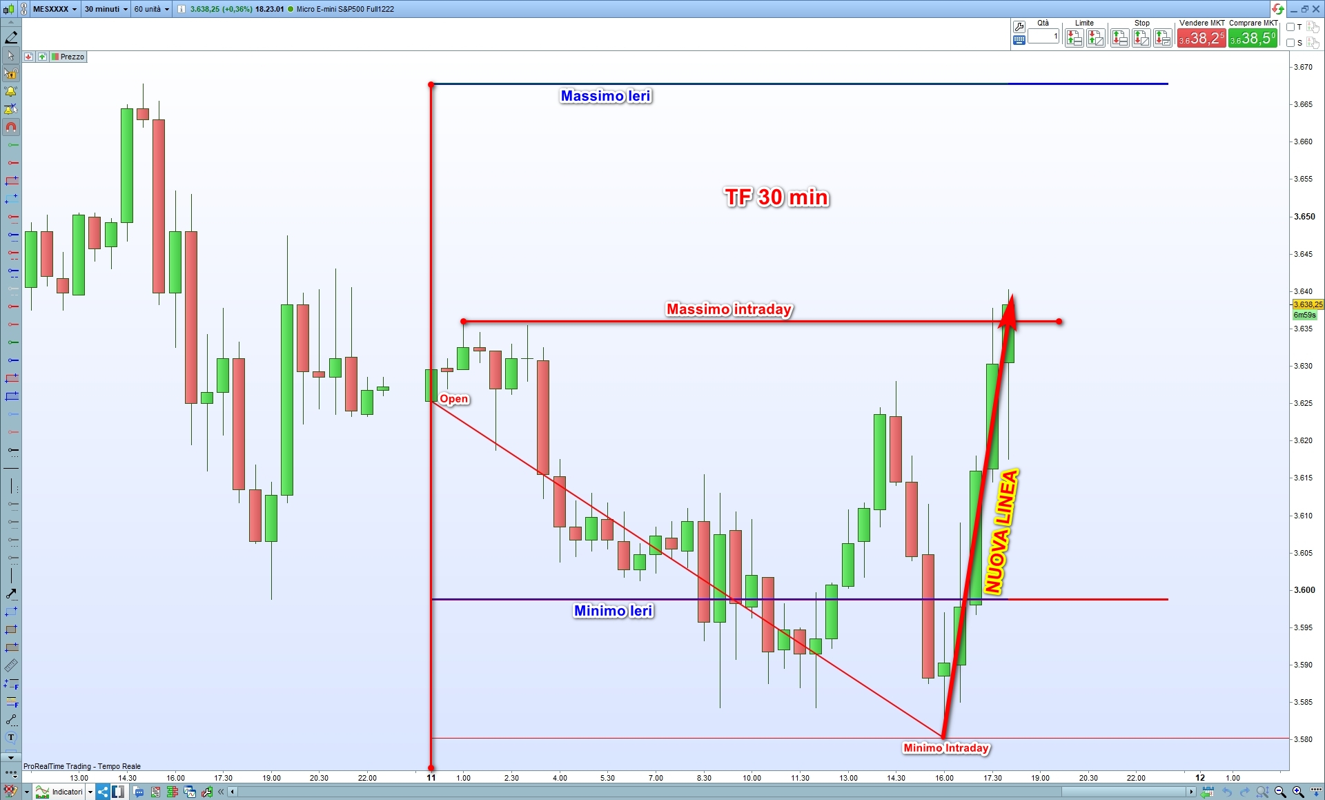 in un TF 30 di un future USA dopo l’apertura ore 00,00 quando il prezzo nell’arco della giornata supera il massimo o il minimo del giorno precedente traccia una linea che parte dall’open della candela 00,00 odierno al massimo o minimo intraday in quel dato momento, se poi il prezzo rintraccia la linea termina.