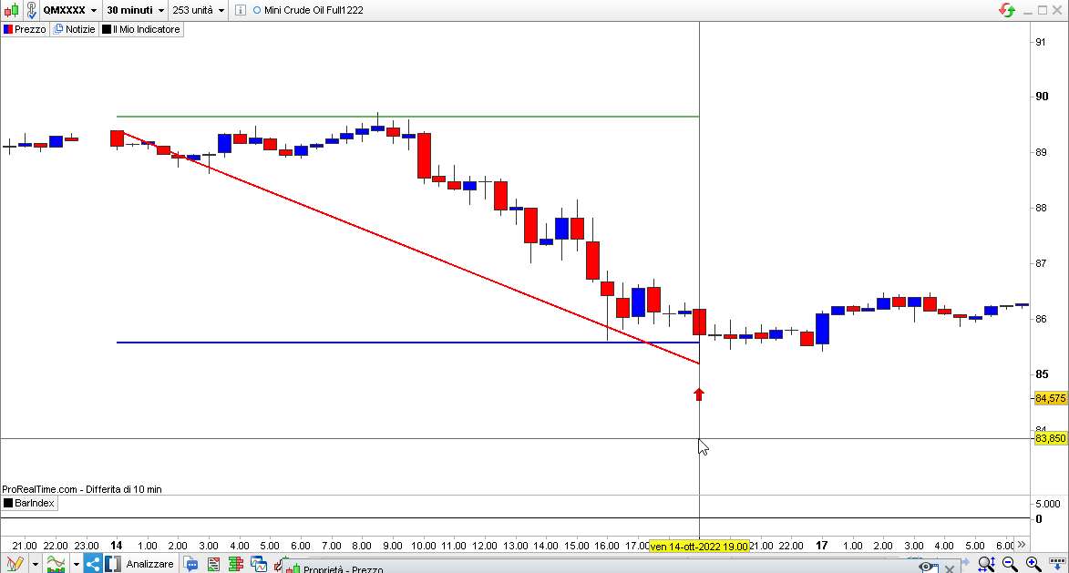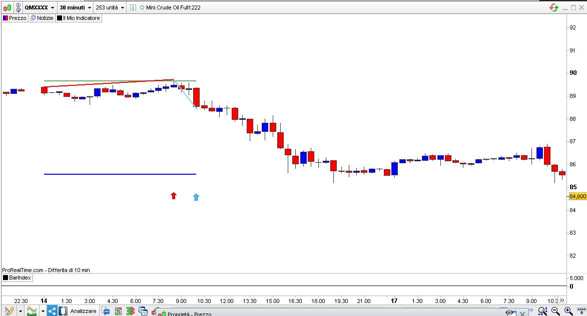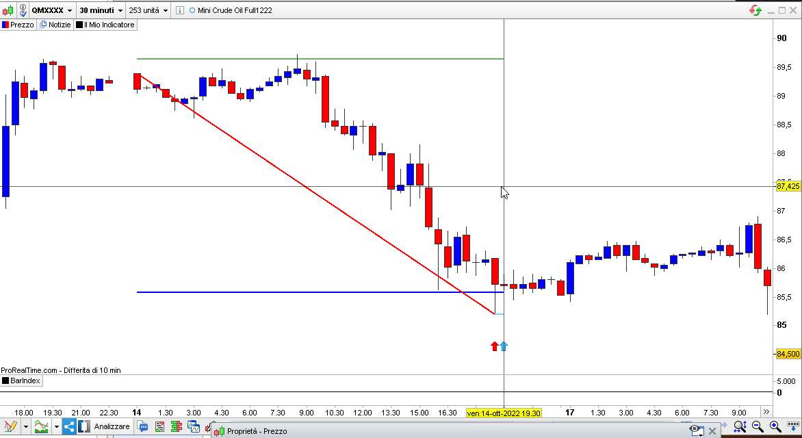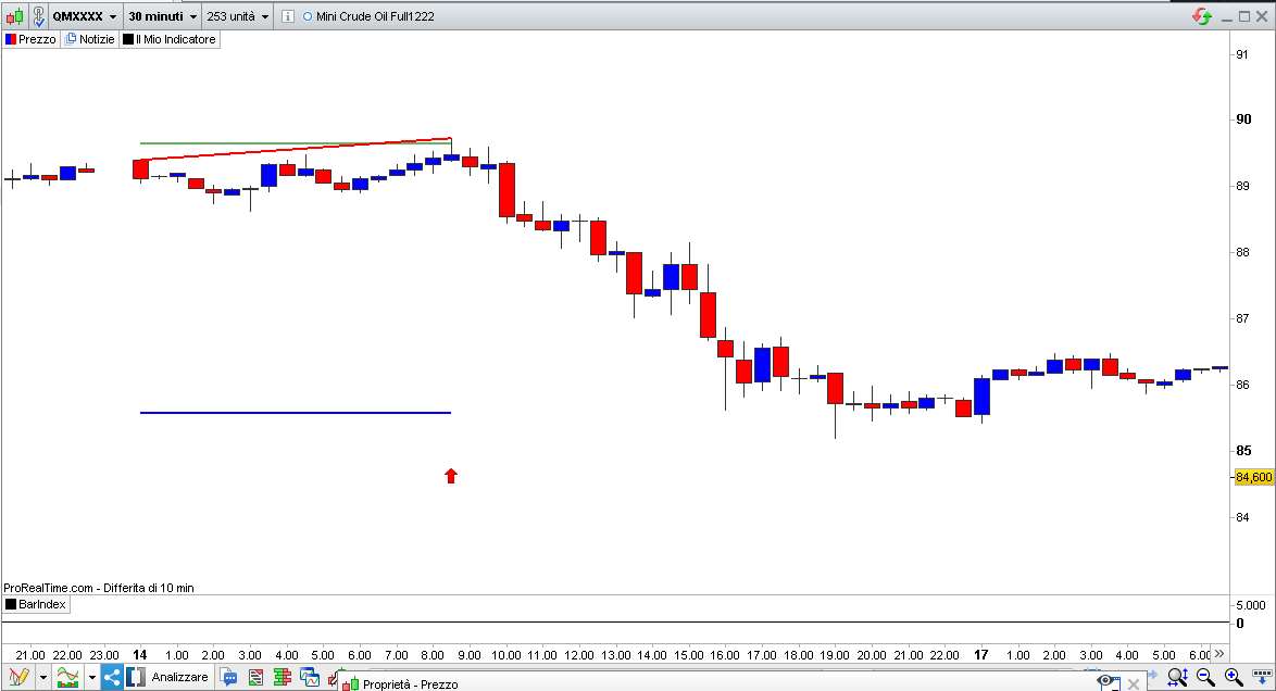 Nelle proprietà ti ho messo un numero finale della barra dove l’indicatore deve smettere di funzionare (tienilo con 6 o 7 “nove”, 9999999, in modo che non termini). Serve solo per il debugging, cioè la verifica del funzionamento, per le barre passate. Se tu vuoi verificarne il funzionamento dalla barra 260 (supponendo che adesso sia 1000 o più) mettici il valore 260 e poi incrementa quel numero col mouse barra dopo barra per vedere come le linee cambiano sul grafico.