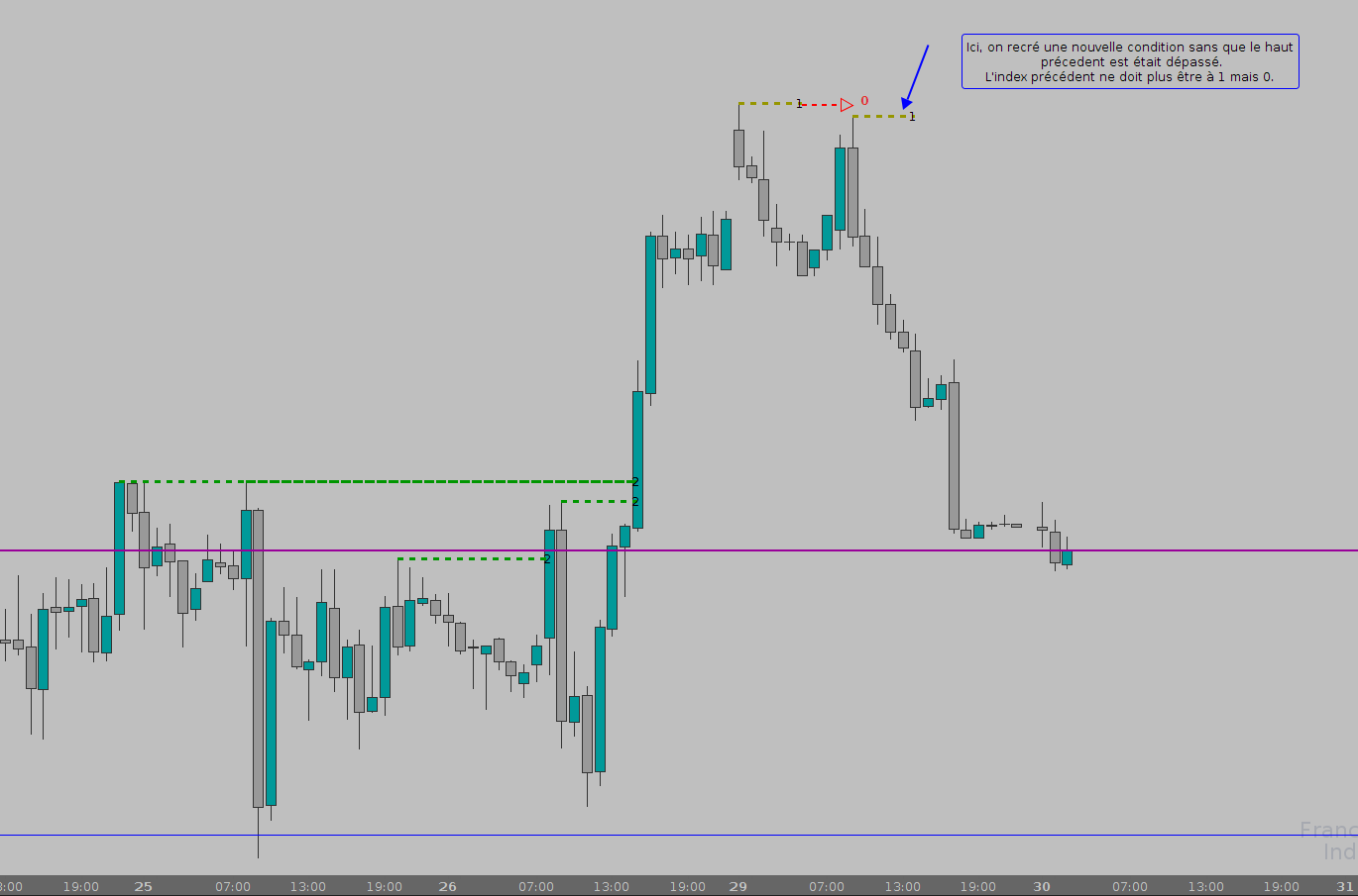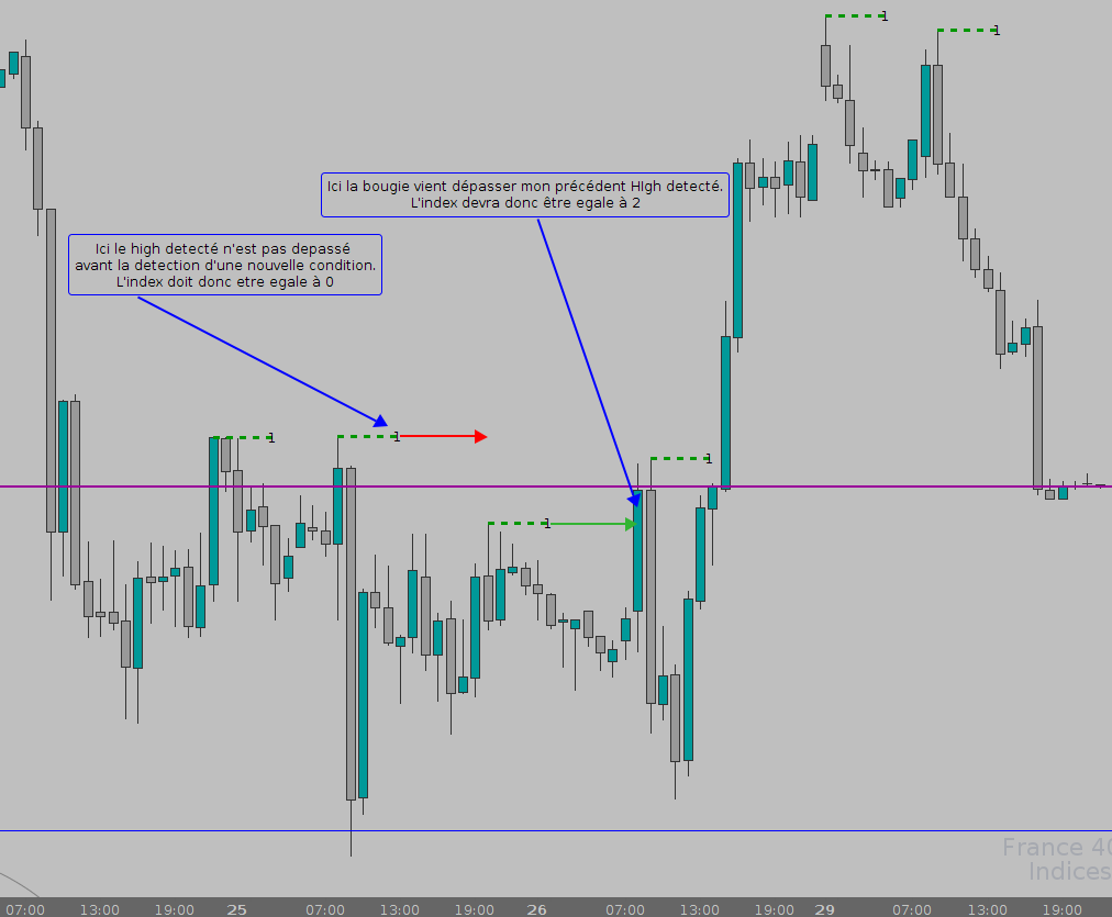 – si un plus haut se créé alors je récupère le barindex de la bougie pour mon tracé de segment et mon “index” = 2