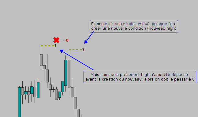 Je souhaite que si un index=1 se materialise et que le precedent index[1] =1 (donc n’as pas vue de high le surpasser alors on l’élimine) alors le precedent index[1] passe à 0.