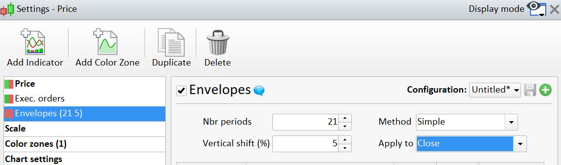 Pour obtenir une bande haut et basse de x%, tu peux utiliser l’indicateur Envelopes, standard dans la plateforme (voir image).