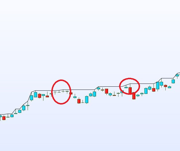 L’objectif visé est de modifier la résistance qui est tracée sur les plus hauts si et seulement si le cours de clôture de la séance en cours est supérieur à la valeur de la résistance de la séance précédente. Je ne souhaite pas passer par la fonction Drawsegment. Pour illuster mes propos j’ai mis deux photocopies d’écran . L’une à l’état initial (les cercles correspondant au descriptif ci dessus) en passant par la fonction HIGHEST et la seconde sur le résultat souhaité (les flèches correspondent à la suppression des marches d’escaliers (fonction HIGHEST). En vous remerciant par avance pour votre aide sur le sujet.