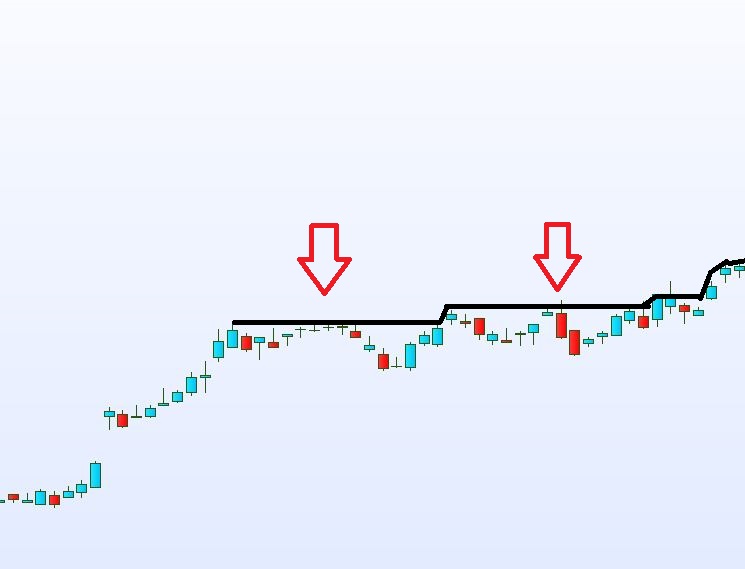 a )si le cours de clôture est supérieure à la résistance tracée à la barre précédente alors la résistance est égale au plus haut de la barre en cours