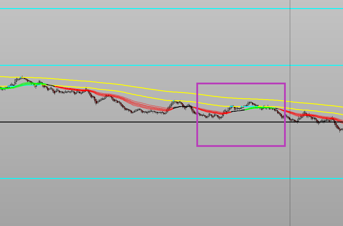 Dans les 2premier screen on voit la premiere réaction : en 100t l’indice rebondi d’un trentaine de point viens tapé dans les MM n’arrive pas a les franchir et continu sa baisse sans grande lutte malgré un multiple de mille soit un niveau assez fort