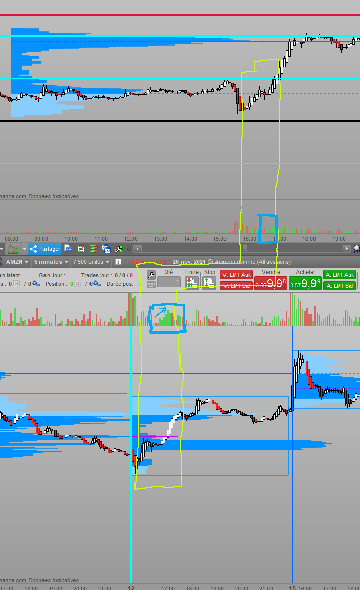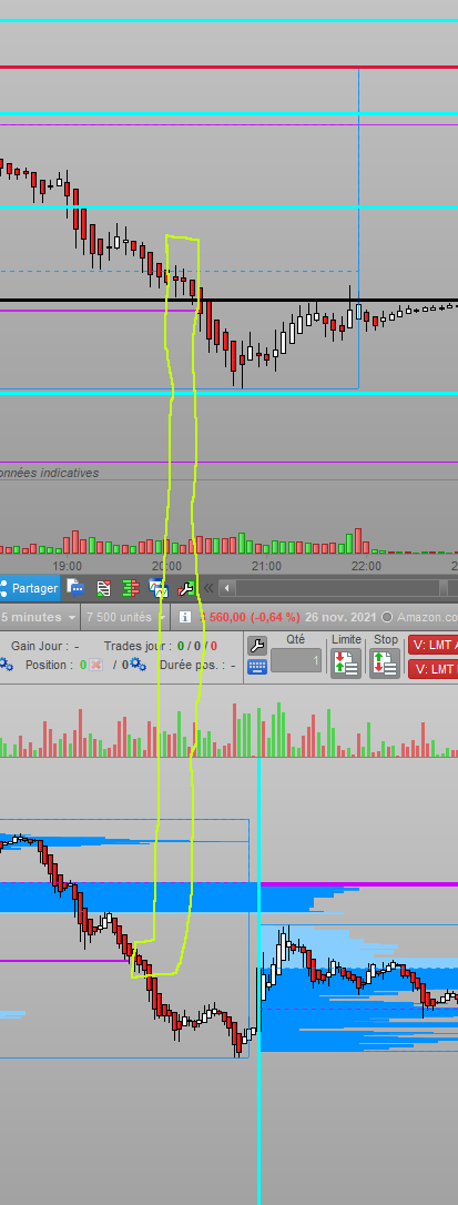 et le 2ieme screen montre le nasdaq en haut et amazon en bas (pris au hasard parmi les poid lourd)en 5min avec le volume sur chaque