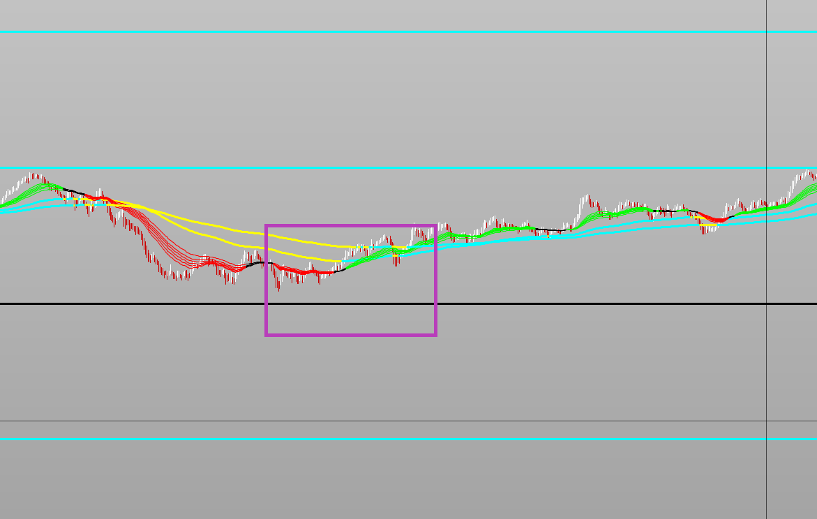 Donc voila avec les 2 systemes que j’utilise le plus pour des trades rapides : le rebond sur chiffre ronds en contre tendance et sur les MM du systeme guppy en 100t (formé des exponentiel 30-50-en vert/rouge auquel j’ajoute mes perso 150-250-en bleu/jaune qui marche bien aussi en tendance)