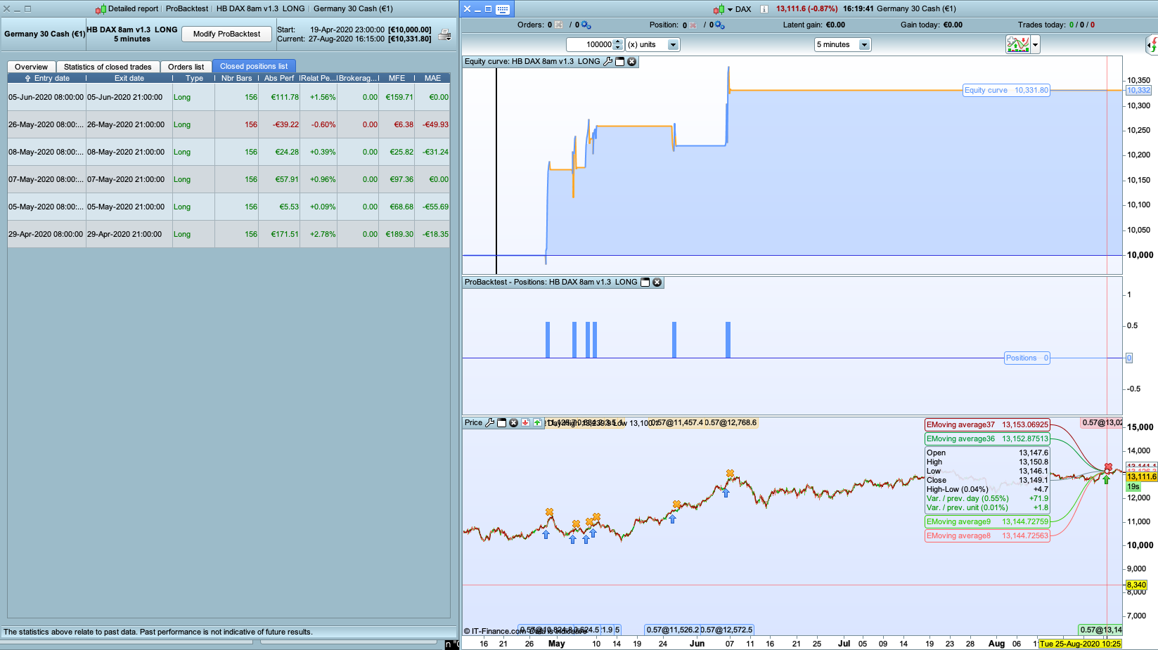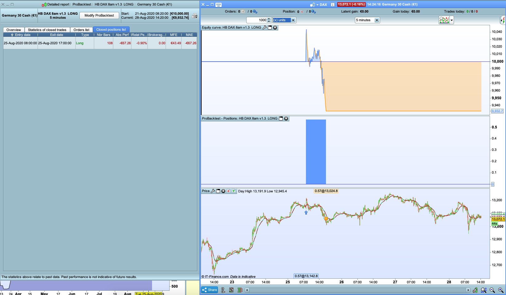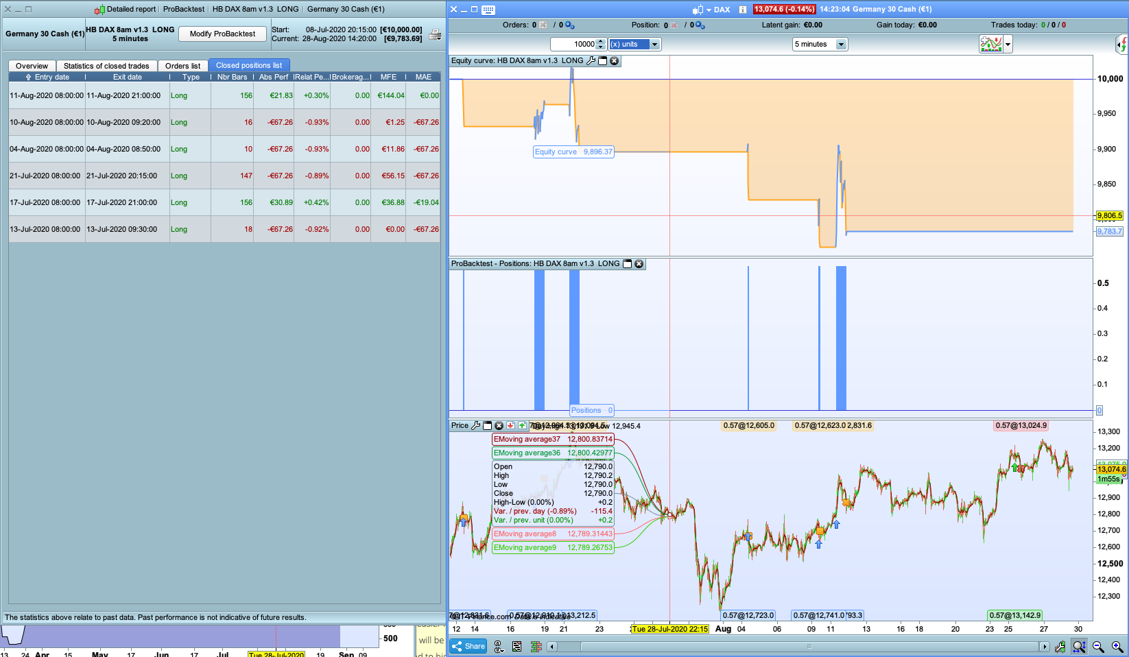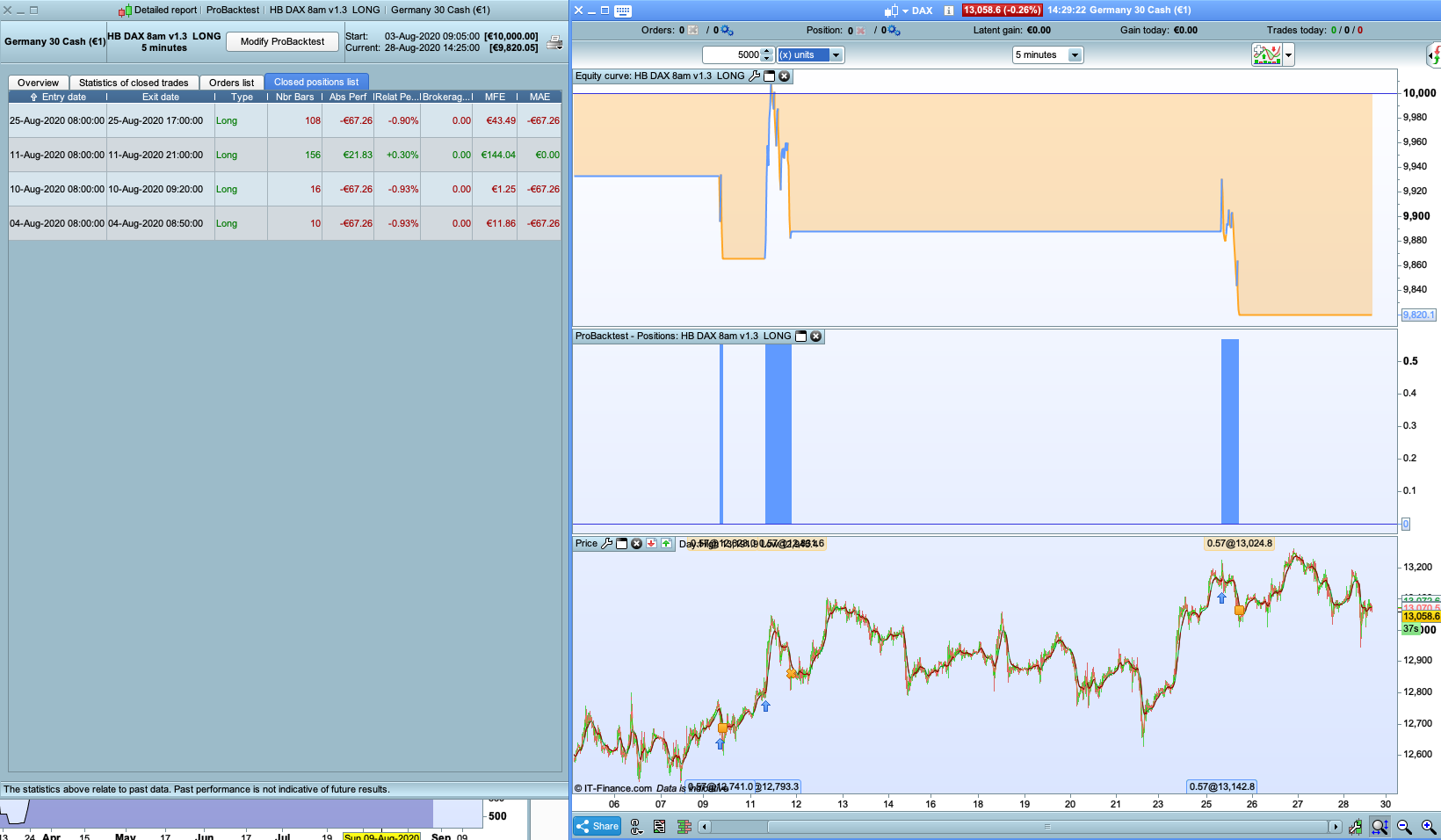 The first screenshot shows the bigger picture going back to 29 April. You’ll see a number of trades on the Price chart that match those in the Detailed Report. However, the final trade (where the cursor is) on the Price chart, on 25 August, isn’t shown in the Closed Positions List and isn’t shown in the Equity chart above the Price chart.