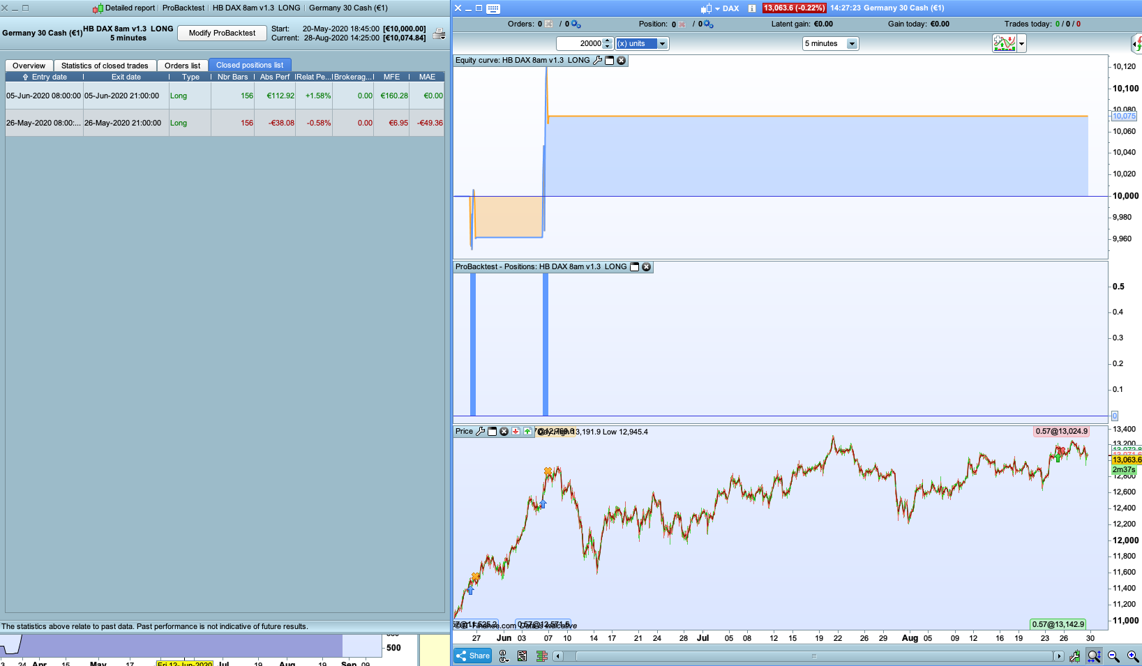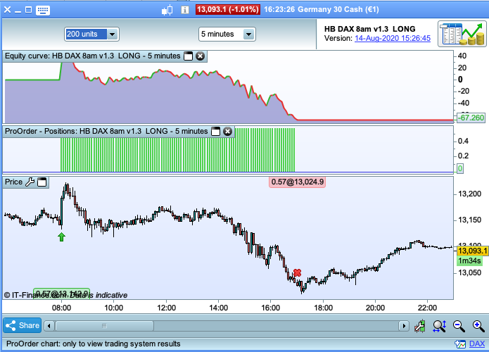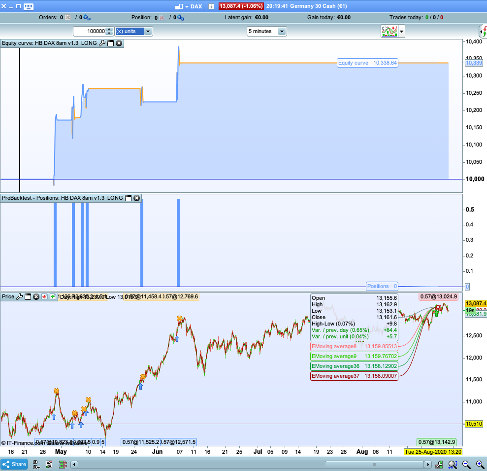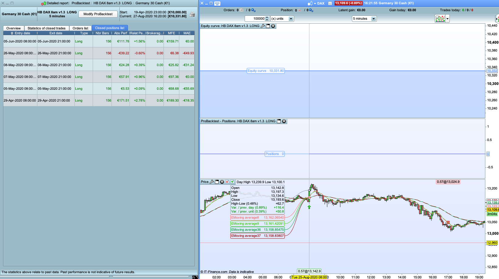 The first screenshot shows the bigger picture going back to 29 April. You’ll see a number of trades on the Price chart that match those in the Detailed Report. However, the final trade (where the cursor is) on the Price chart, on 25 August, isn’t shown in the Closed Positions List and isn’t shown in the Equity chart above the Price chart.