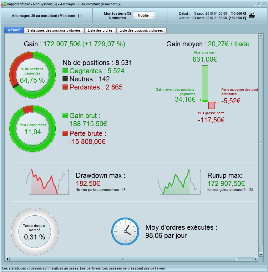Le fait d’avoir la possibilité de faire du Walk Forward sur la prochaine version permettrait de faire des backtest plus robustes et qui collent plus à la réalité, et ne plus croire au Graal lorsque l’on obtient ces résultats en 5 mn de prog (Cf graph, Dax en 5 mn depuis le 1 septembre avec un spread de 1, et donc sans slippage puisque c’est un backtest)