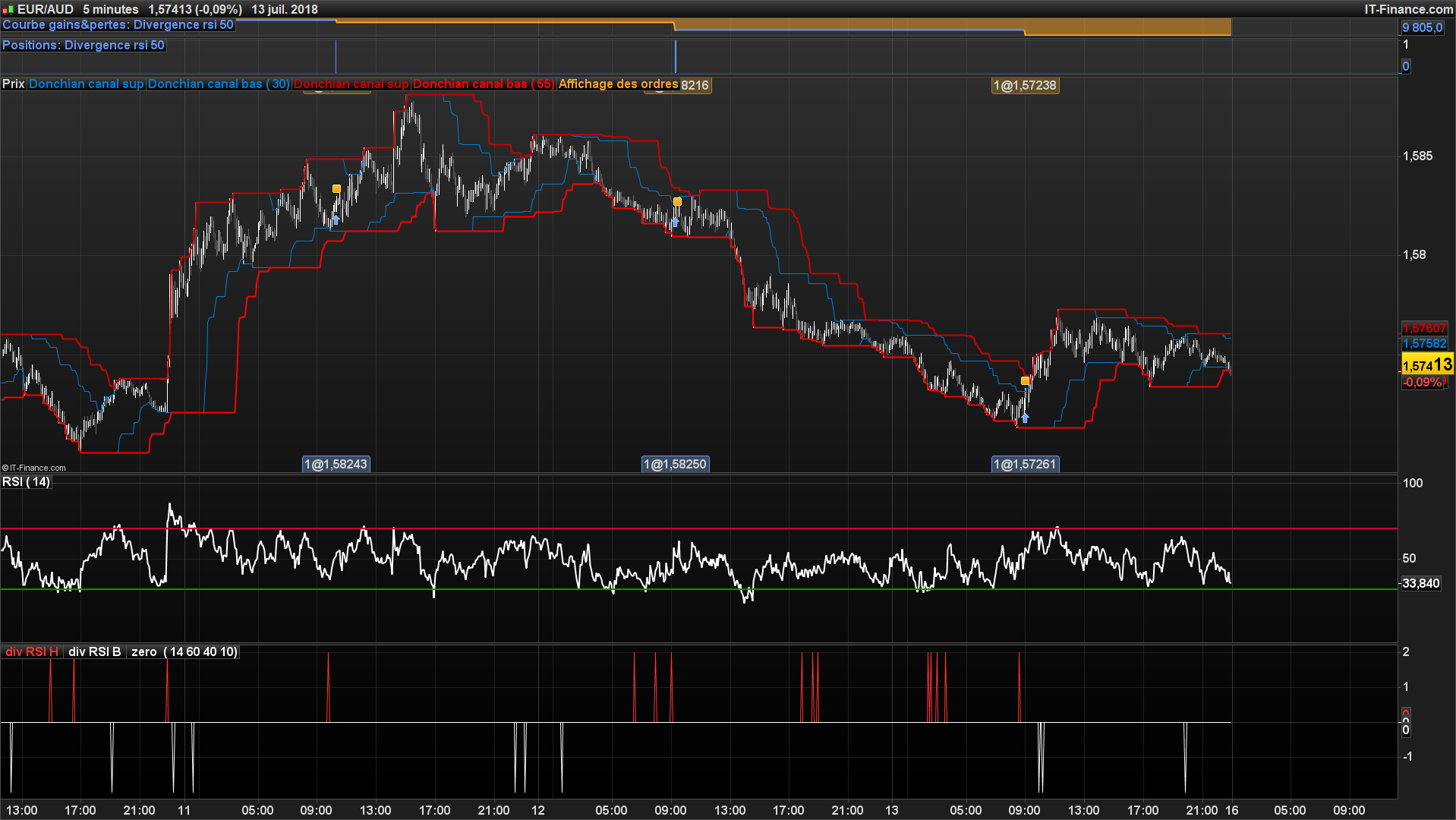 En clair, j’aimerais que le robot “shorte” lorsque le RSI clôture sous 50 et si le RSI divergeait à la baisse dans un délai de 30 chandeliers.