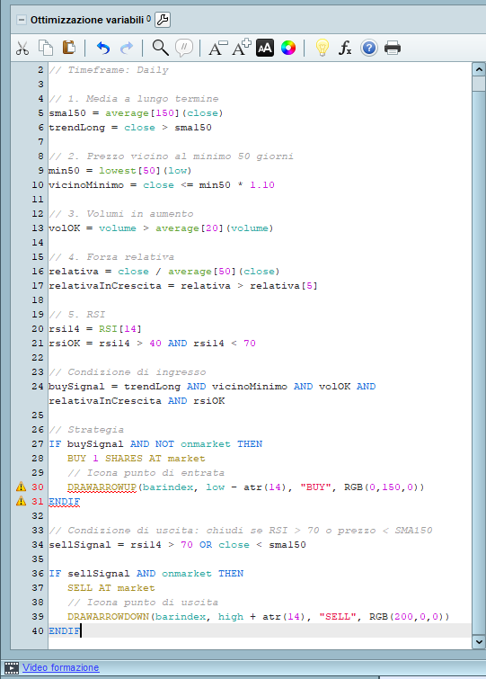 buySignal = trendLong AND vicinoMinimo AND volOK AND relativaInCrescita AND rsiOK