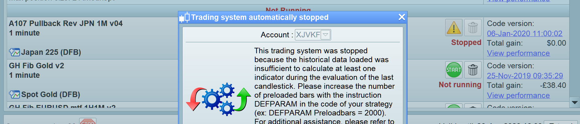 This trading system was stopped because the historical data loaded was insufficient to calculate at least one indicator during the evaluation of the last candlestick. Please increase the number of preloaded bars with the instruction DEFPARAM in the code of your strategy (ex: DEFPARAM Preloadbars = 2000). For additional assistance, please refer to the help text of the DEFPARAM function in the trading systems programming manual.