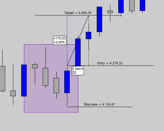 - Stop loss: 2 pip sotto il minimo più basso delle ultime 4 sedute (delle 4 candele che formano il pattern)