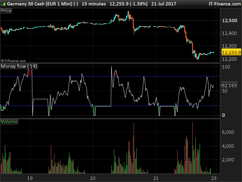 it uses the Money Flow Index, which I had never used before. When added to a chart it behaves correctly, within the limits (80 – 20), but when referenced in a strategy its values yields odd results, ranging from, say, +20000 to -10000.