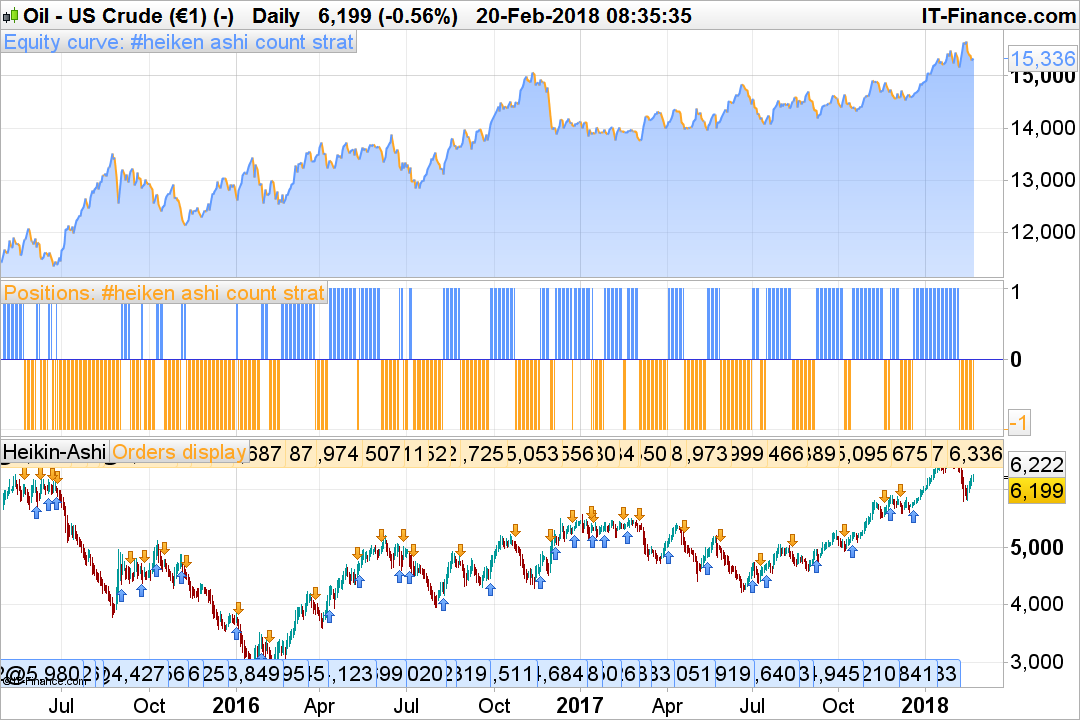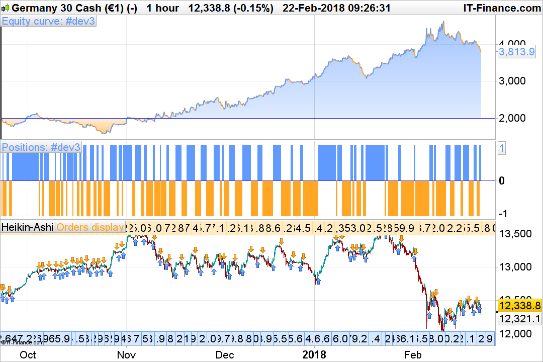 Bear in mind, that orders are always put on market at next open, that’s why you’ll see a 1 period delay on the price chart. It is a simple strategy but has the merit of being quite correct, it could be refined with the usual bells and whistles, trailing stop, breakeven, money management, etc.