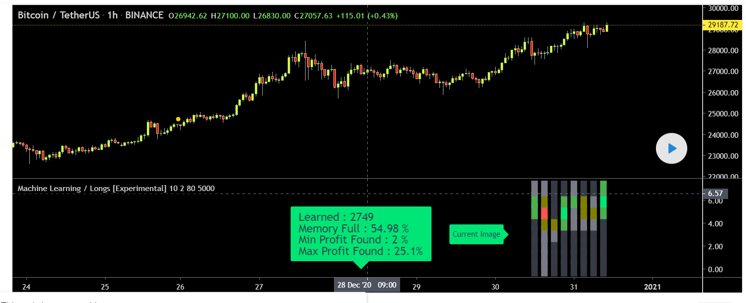 El script solo funciona para posiciones largas. Ahora veamos cómo funciona: En cada vela crea una imagen de las últimas 8 velas. antes de crear la imagen, encuentra los niveles más alto / más bajo de 8 velas y crea una cadena con longitudes de 64 (8 * 8). Y para cada cuadrado, comprueba si contiene mecha, cuerpo verde o rojo, cuerpo verde o rojo con mechas. IMAGEN: Cada cuadrado obtiene el valor: 0: nada en él 1: solo mecha en ella 2: solo cuerpo rojo en él 3. solo cuerpo verde en él 4: cuerpo rojo y mecha en él 5: cuerpo verde y mecha en él Y luego verifica si el precio subió igual o más alto que el beneficio definido por el usuario. Si es así, agrega la imagen a la memoria / matriz. Y llamo a esta parte como parte de aprendizaje. si hay 1 o más elementos en la memoria, crea una imagen para las 8 velas actuales y verifica la memoria si hay imágenes similares. Si la imagen tiene una similitud más alta que el nivel de similitud definido por el usuario, entonces si muestra la etiqueta “Coincidido” y la tasa de similitud y la imagen en la memoria. si encuentra alguno con la tasa de similitud es igual / mayor que el nivel definido por el usuario, entonces deja de buscar más.