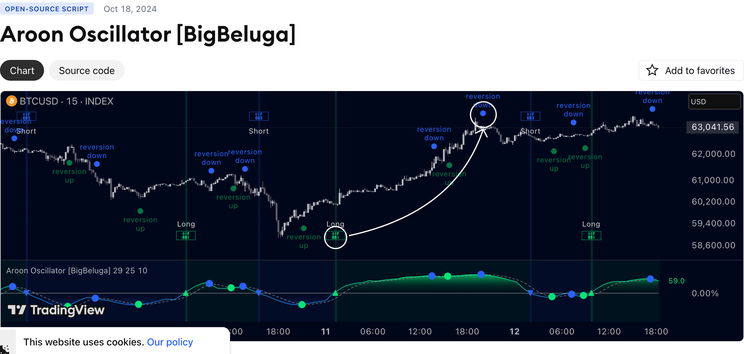 plotchar(ta.crossunder(aroon_osc, 0) and trend_sig, “Short (Chart)”, “🢃”,