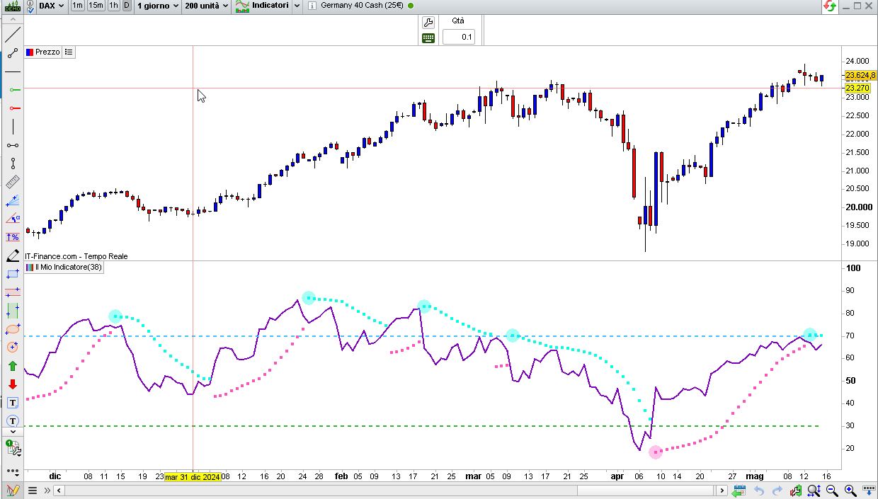 return src as "RSI" style(line,2), psarRSI as "Parabolic SAR rsi" style(point,2)coloured(r,g,b), upper as "OB level" style(dottedline),lower as "OS level" style(dottedline)