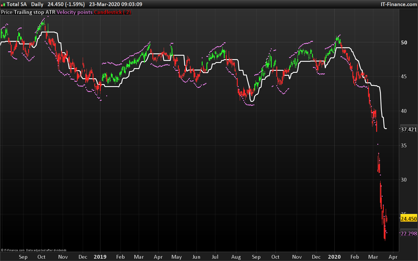 J ai essayé l ATR stop de Nicolas, mais il n est pas tout à fait semblable ds le sens ou il fait des pics qui n existe pas sur l exemple ds le lien, je pense que c est parce qu il y a peut être quelque part la prise en compte des plus haut sur 15 période comme pour un canal donchian